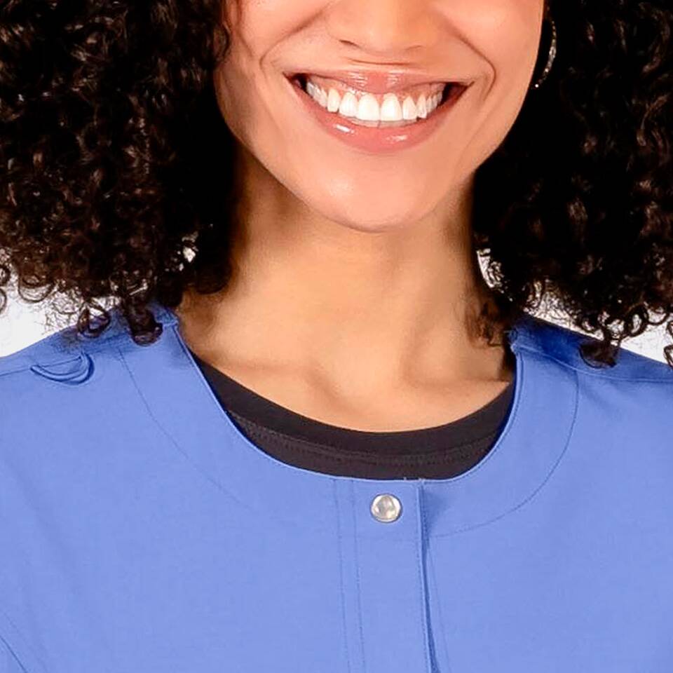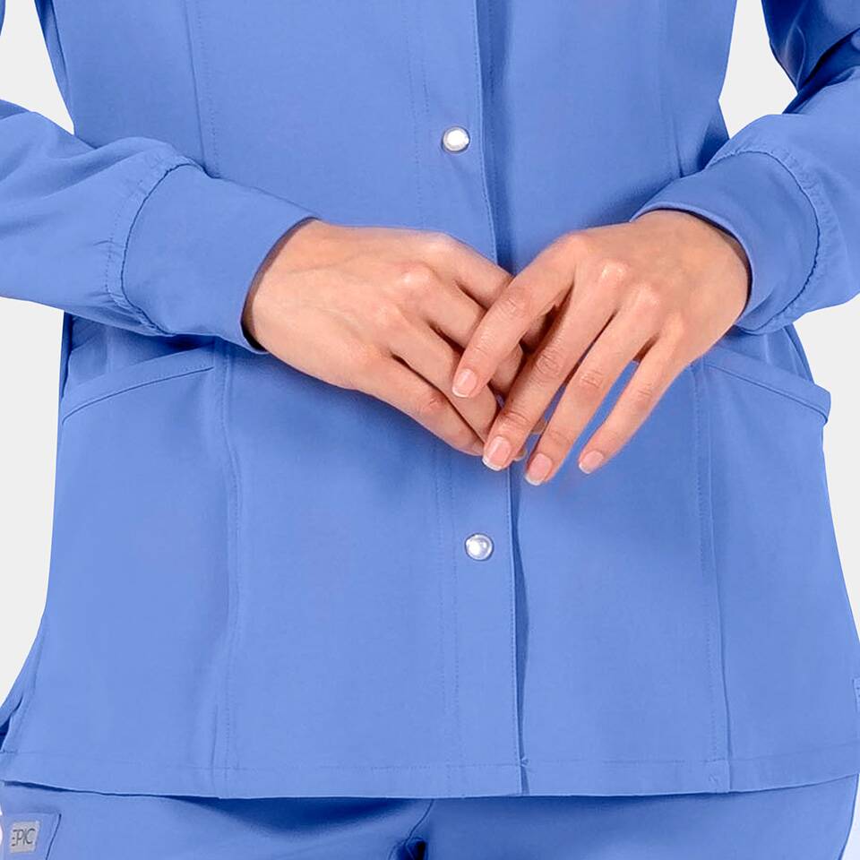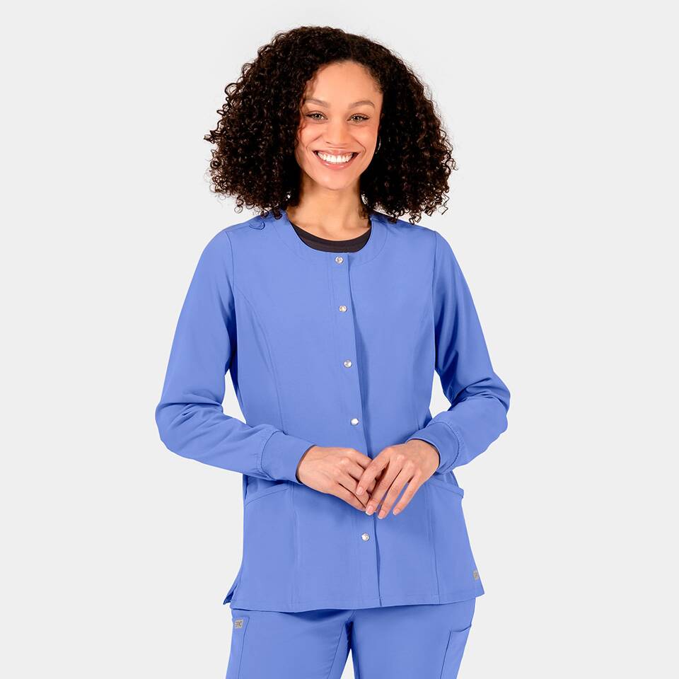Stay stylish and comfortable with our Women’s Snap Jacket. Featuring a round neck design with decorative pearl snap closure, this jacket is perfect for any type of work shift. Its functional dyed-to-match bungee loop at the shoulder seam and micro knit sleeve cuffs ensure a snug fit, while the two front patch pockets with a zip cell phone pocket provide ample storage space for your essentials. Stay fashionable while staying practical.