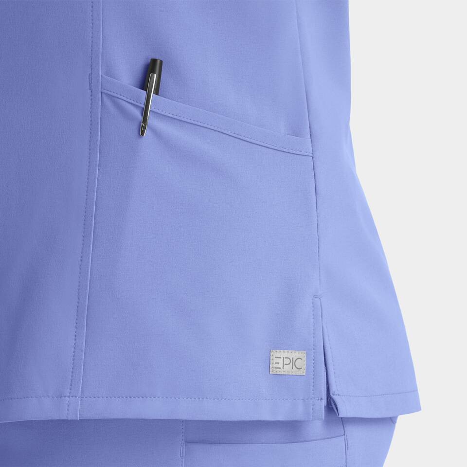 Women’s round neck jacket with decorative pearl snap closure, Functional dyed-to-match bungee loop at shoulder seam, Dyed-to-match micro knit sleeve cuffs, Two front slant patch pockets with a zip cell pocket, Front and back princess seams for added style and shape, Decorative logo neck tape at inner back neck, Side slits